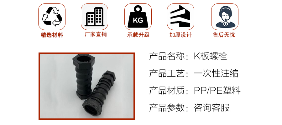 K板螺栓用于建筑用铝模板上,此款K板螺栓可代替原大铁锥型K板螺栓,成本较之节省一大半,K板螺栓有2部分组成,一个是外六角螺栓螺丝(长度可选2种 ),一部分是塑料椎体,两者相互配合使用。 |
